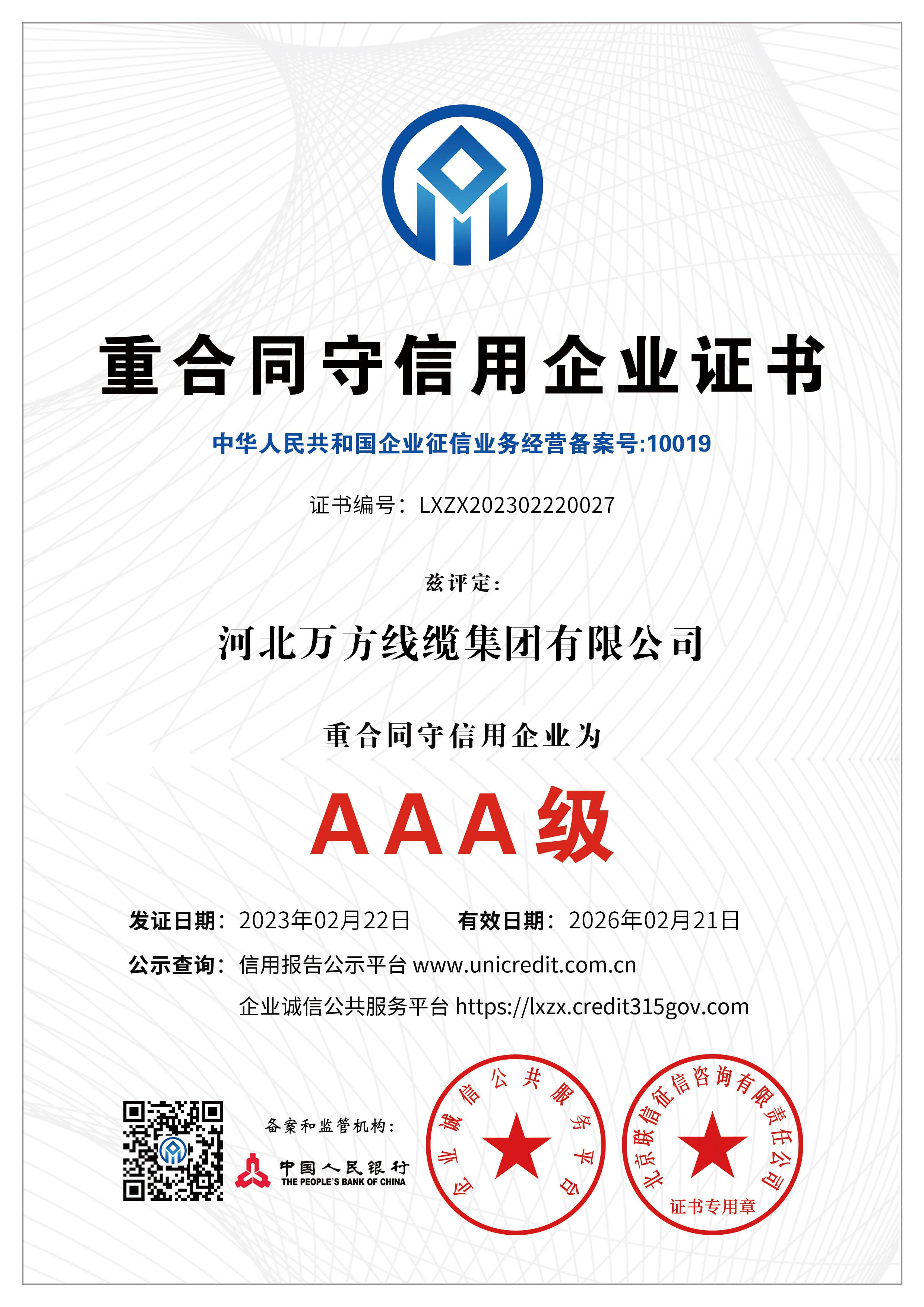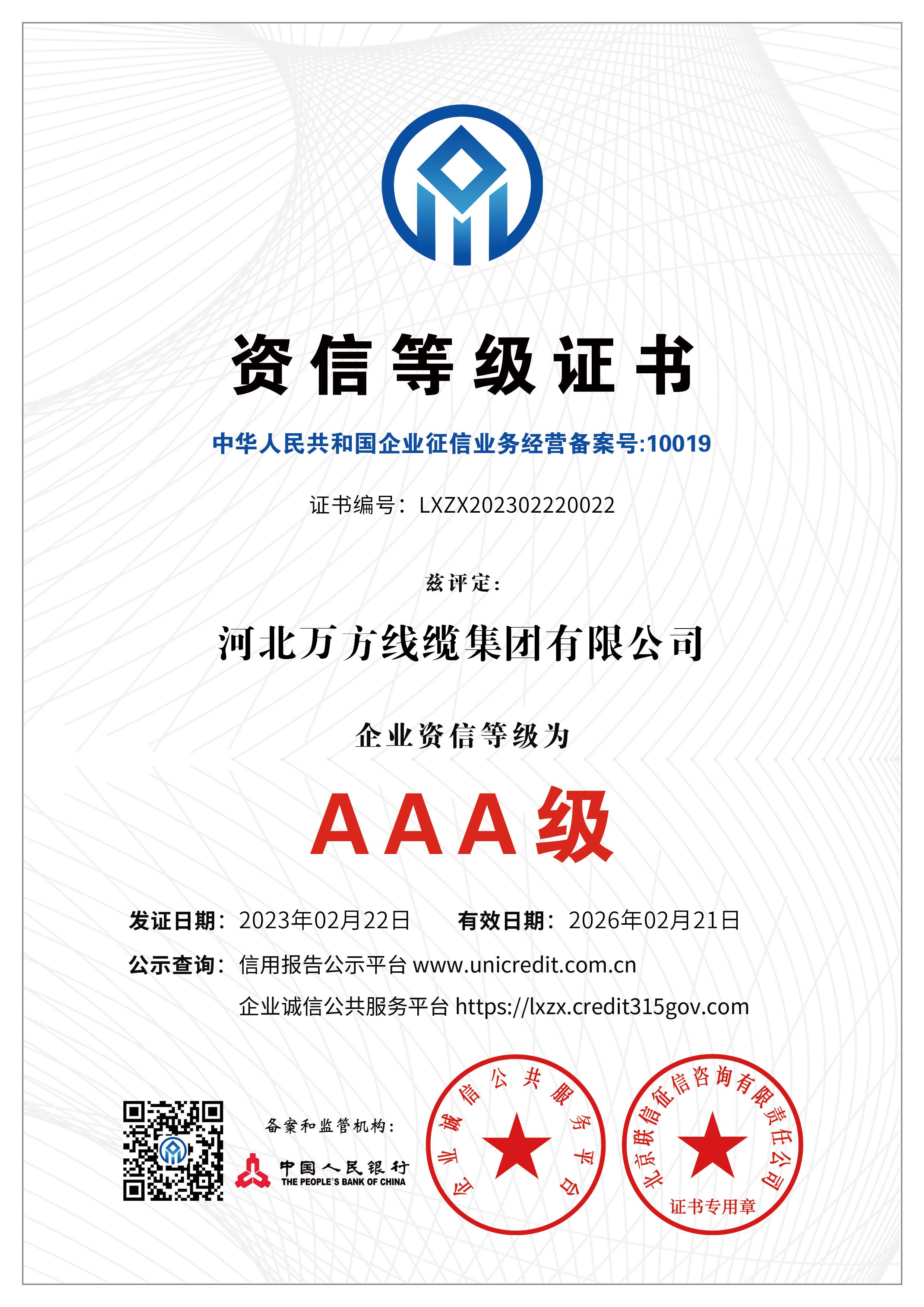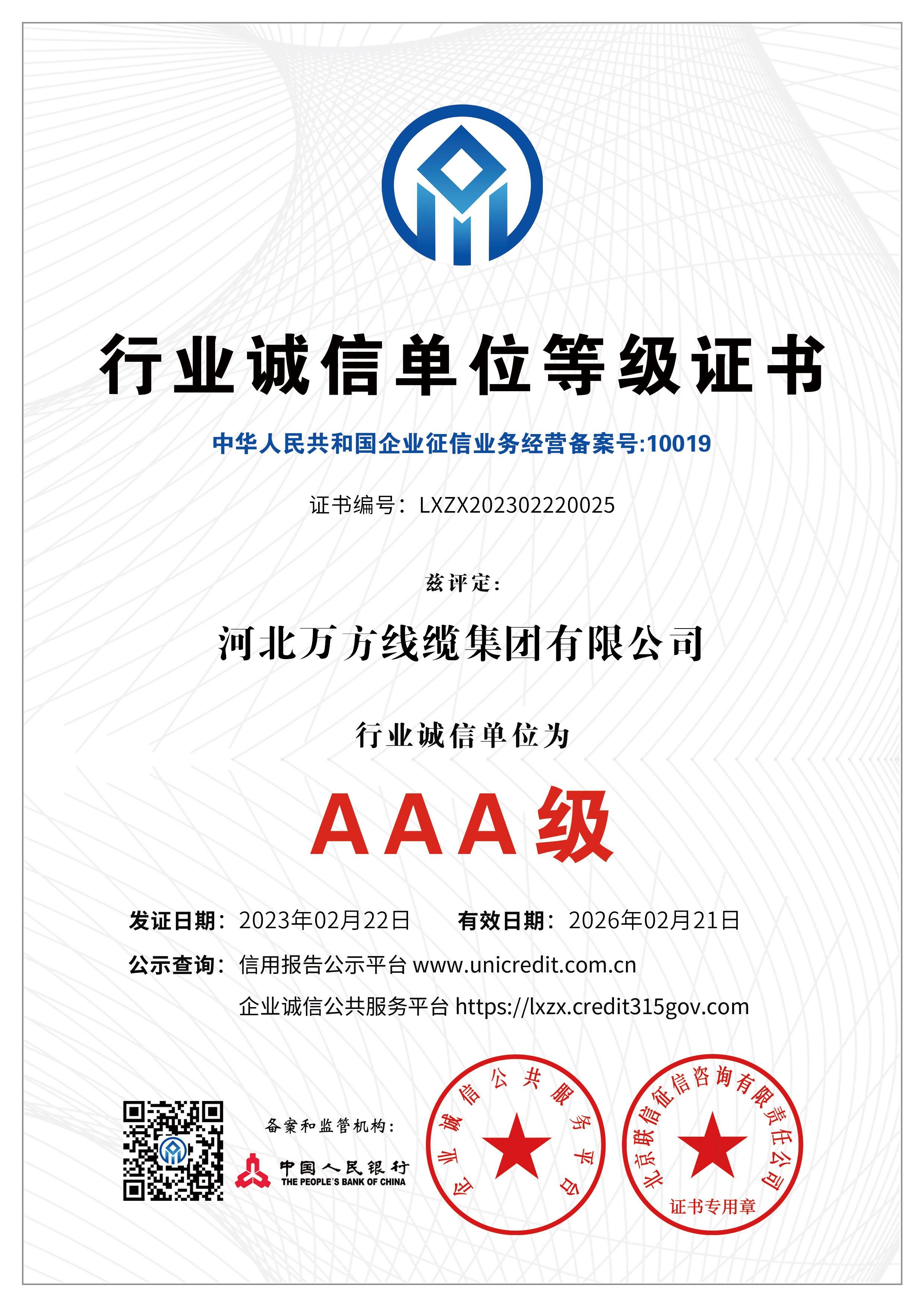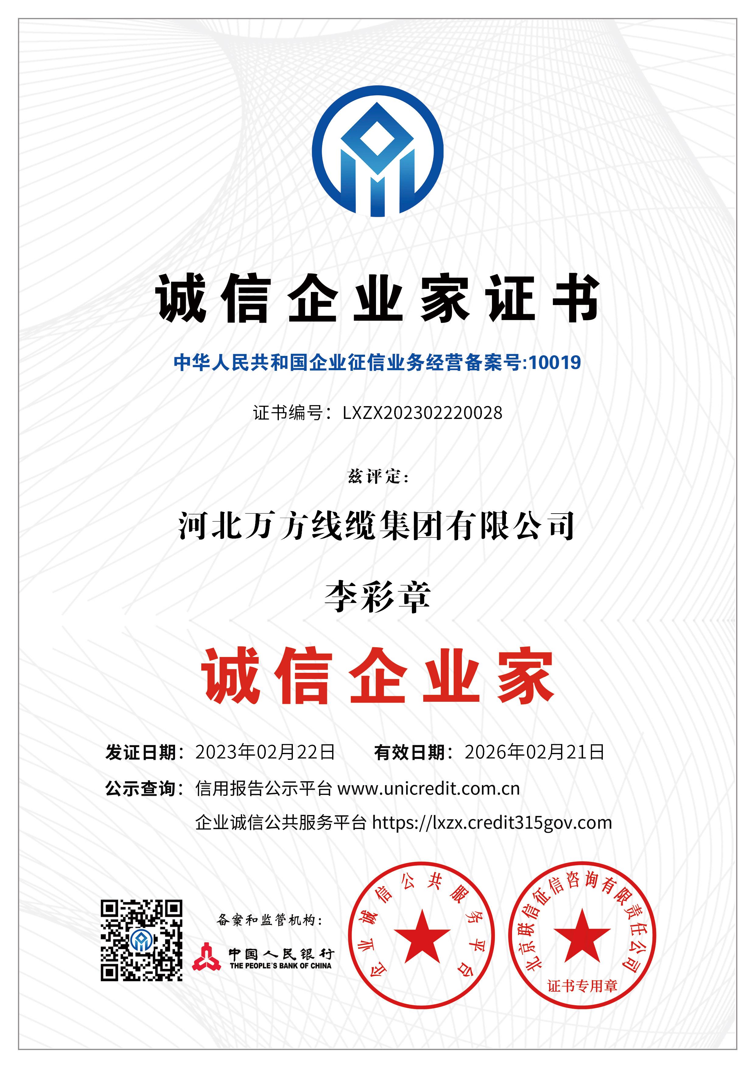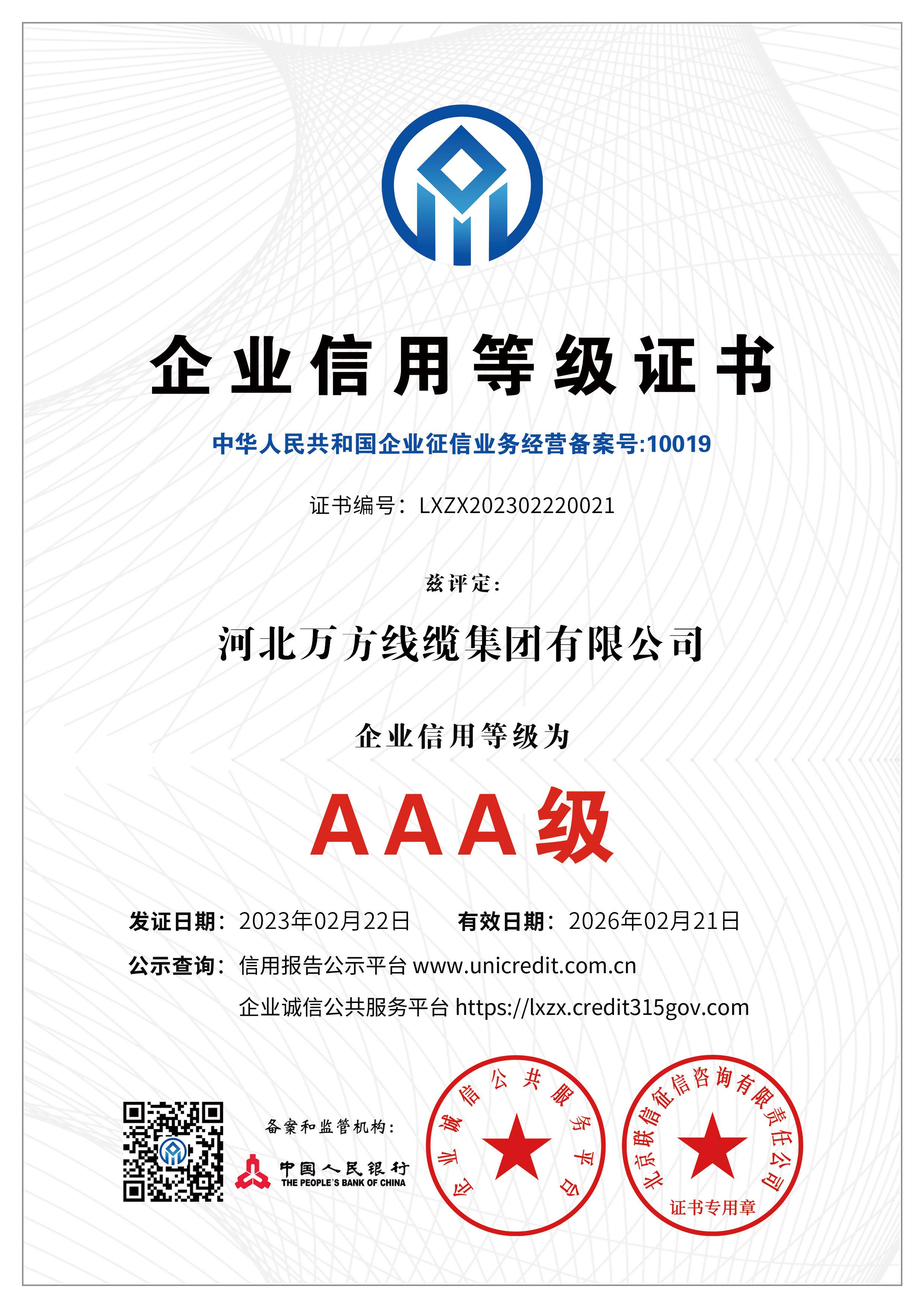 企业被评为:高新技术企业;中国驰名商标;全国行业质量领先企业;全国质量诚信先进企业;全国质量检验稳定合格产品;全国质量检验信得过产品;全国行业质量领先品牌;河北省专精特新示范企业;河北省科学技术成果证书;河北省创新型中小企业;河北省著名商标;河北省名牌产品;河北省质量效益型先进企业;守合同重信用单位;河北省消费者信得过单位;邢台市“文明单位”;国家知名品牌;中国线缆行业100强企业;中国电线电缆企业综合实力200强;河北省最具影响力百强诚信企业等荣誉称号;“AAA级”企业信用等级证书;“AAA级”资信等级证书;“AAA级”重合同守信用企业证书;“AAA级”诚信供应商等级证书;“AAA级”诚信经营示范单位证书;“AAA级”行业诚信单位等级证书;“AAA级”质量、服务诚信单位证书;碳中和承诺示范单位;绿色环保推厂企业;中国节能环保产品;绿色制造企业;邢台市纳税百强企业;邢台市企业技术中心;中国质量奖;中国工业大奖;中国科技进步奖。