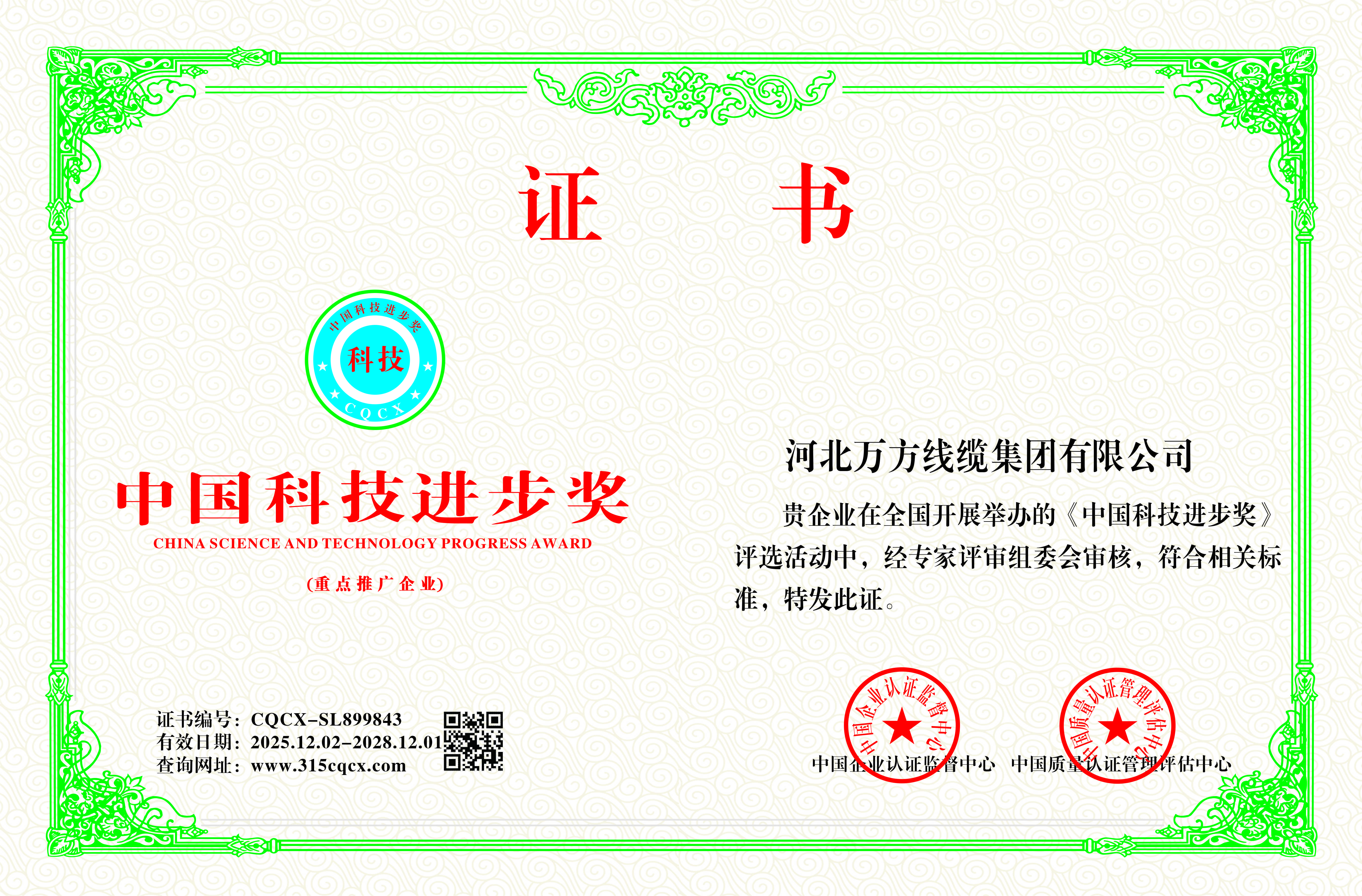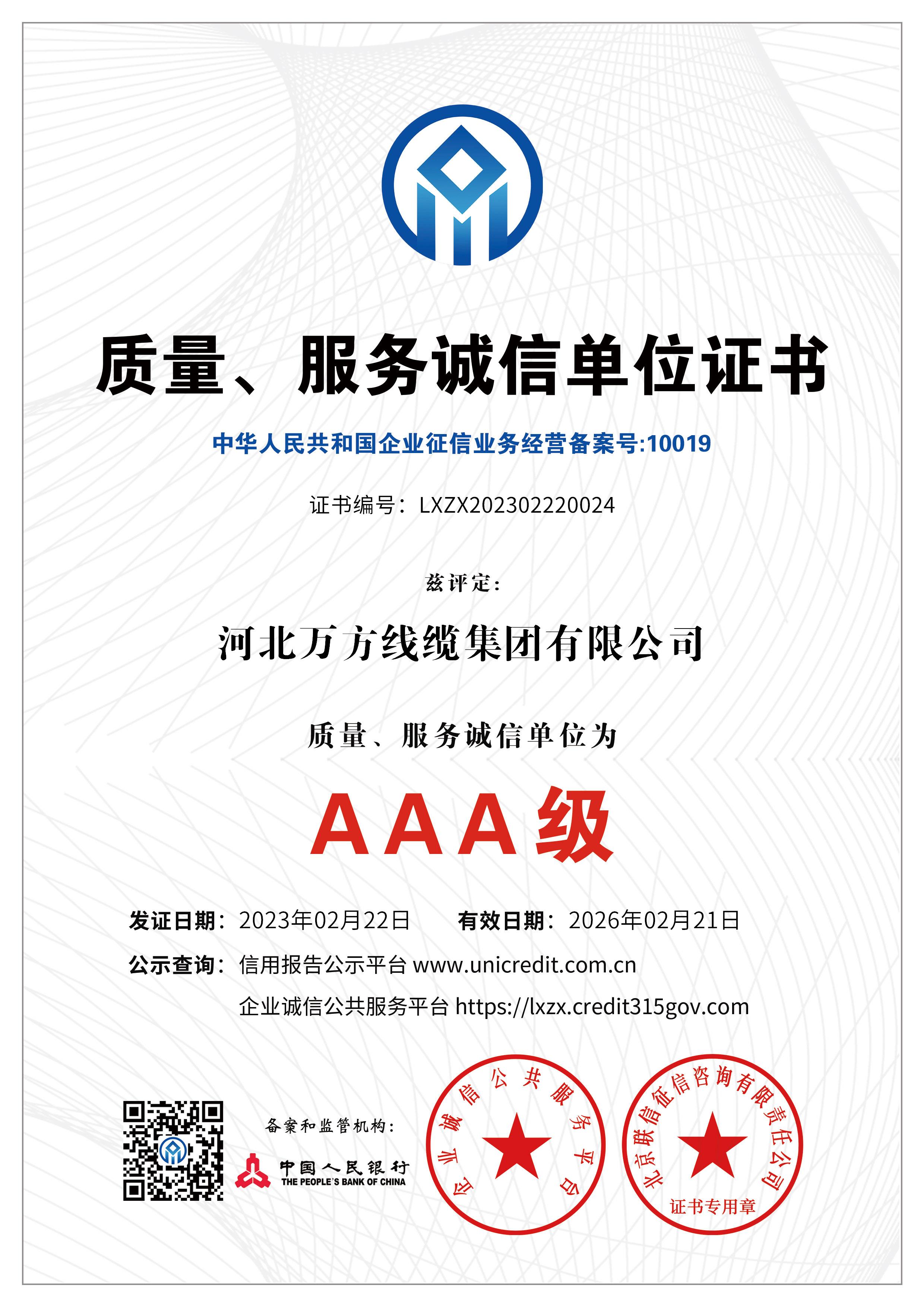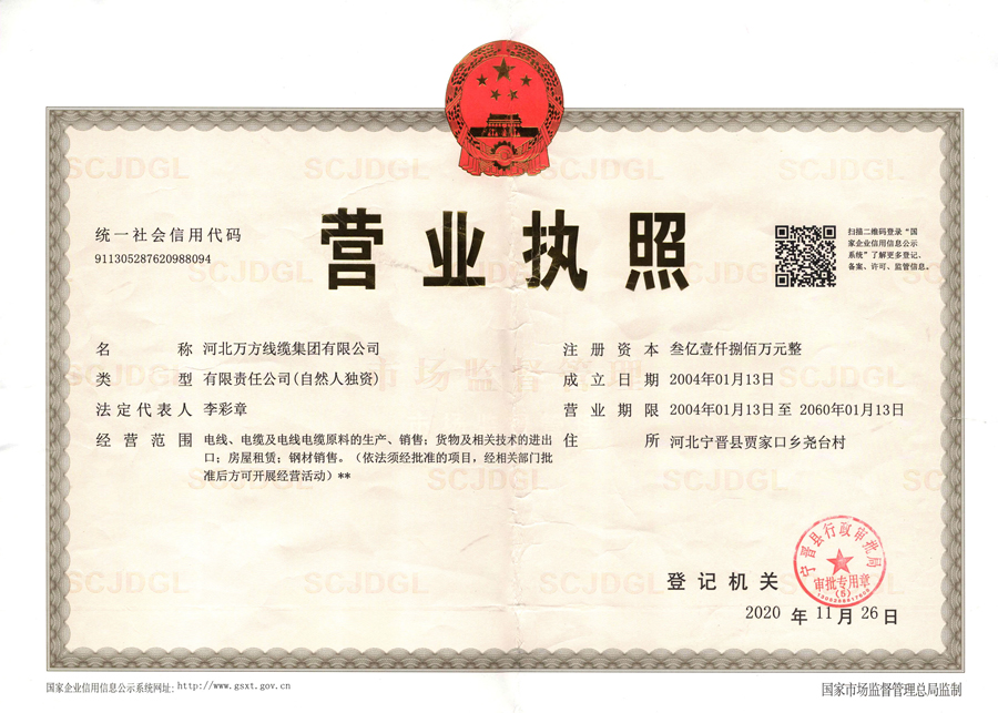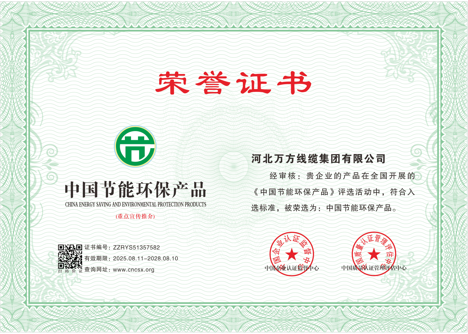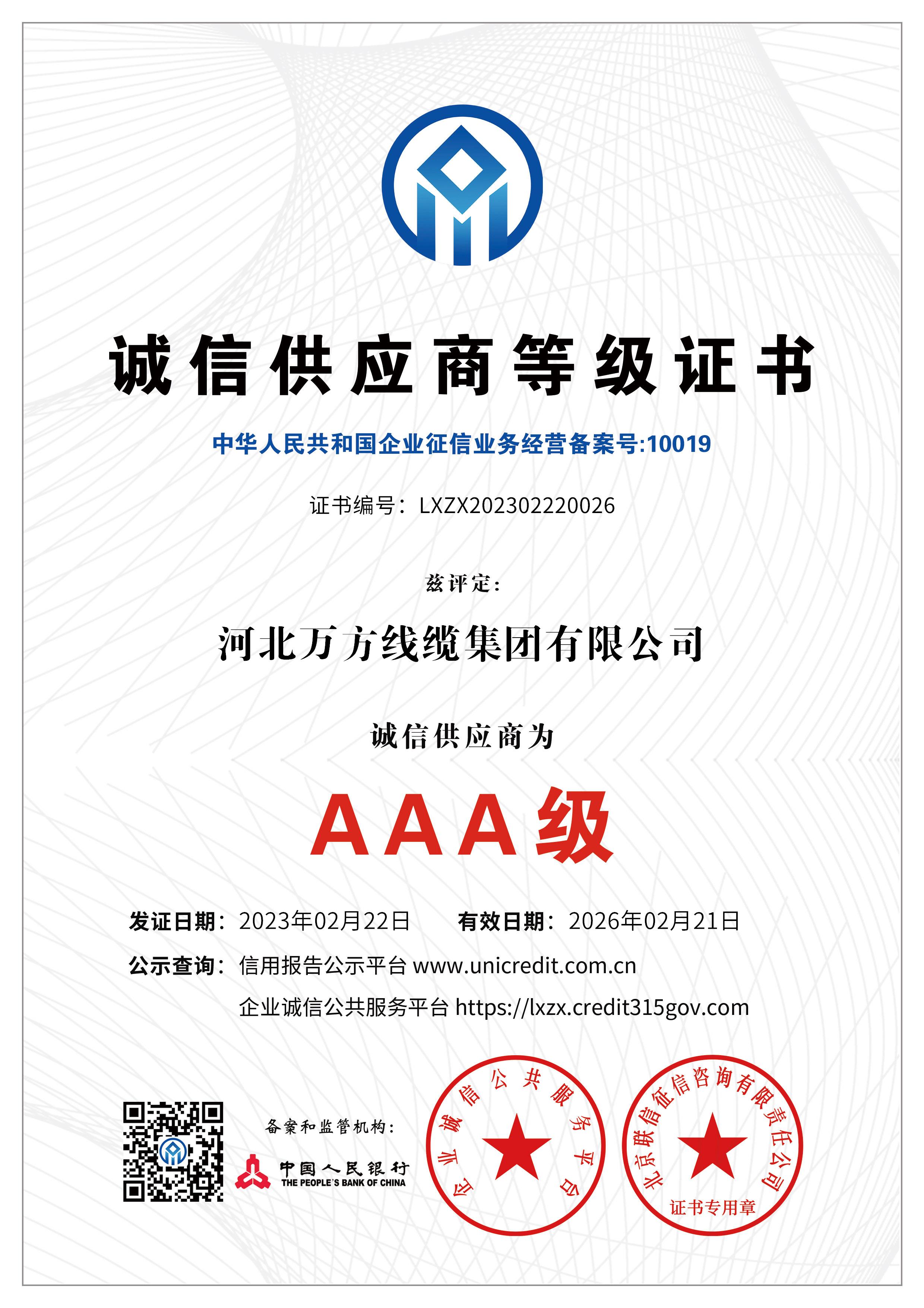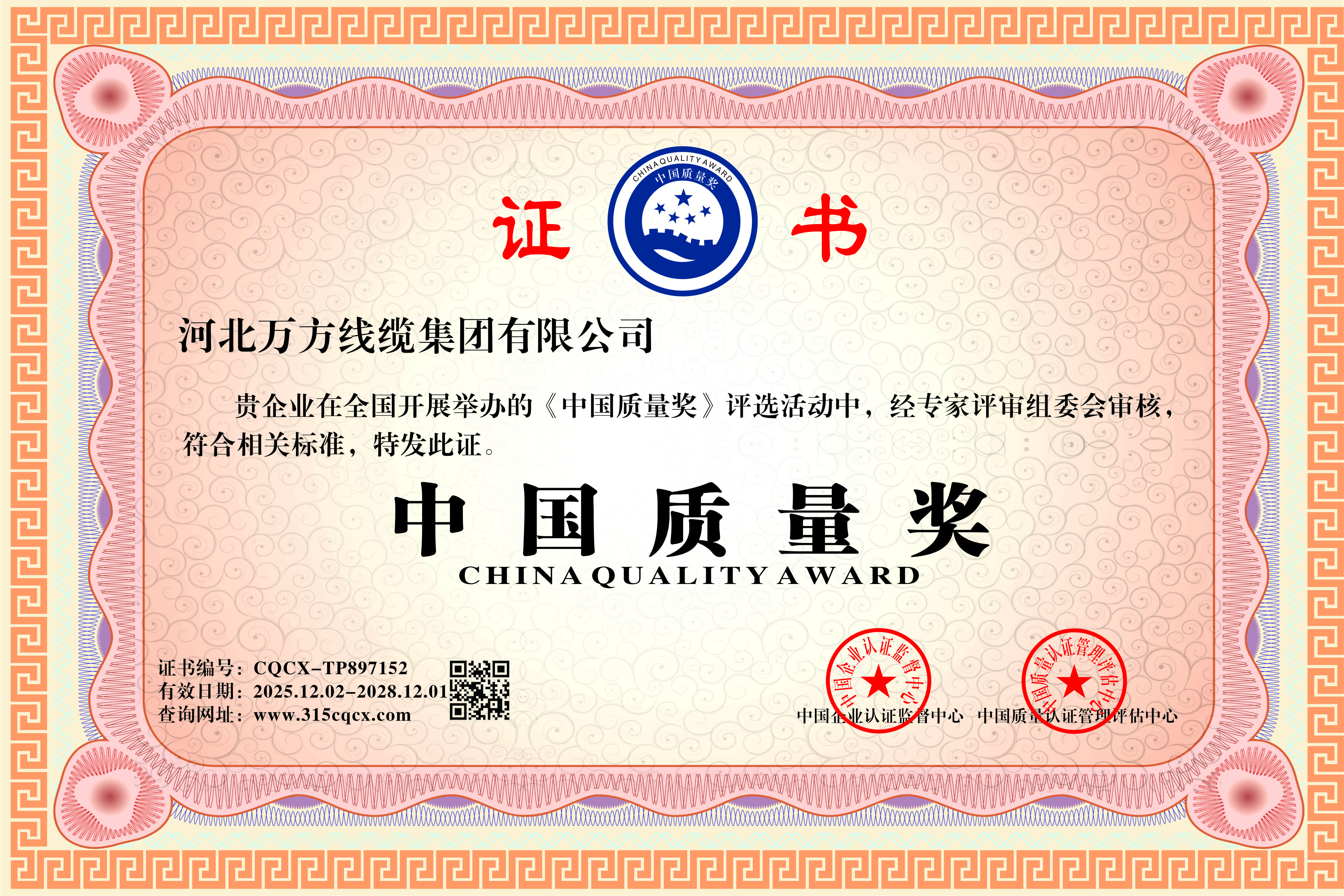 企业被评为:高新技术企业;中国驰名商标;全国行业质量领先企业;全国质量诚信先进企业;全国质量检验稳定合格产品;全国质量检验信得过产品;全国行业质量领先品牌;河北省专精特新示范企业;河北省科学技术成果证书;河北省创新型中小企业;河北省著名商标;河北省名牌产品;河北省质量效益型先进企业;守合同重信用单位;河北省消费者信得过单位;邢台市“文明单位”;国家知名品牌;中国线缆行业100强企业;中国电线电缆企业综合实力200强;河北省最具影响力百强诚信企业等荣誉称号;“AAA级”企业信用等级证书;“AAA级”资信等级证书;“AAA级”重合同守信用企业证书;“AAA级”诚信供应商等级证书;“AAA级”诚信经营示范单位证书;“AAA级”行业诚信单位等级证书;“AAA级”质量、服务诚信单位证书;碳中和承诺示范单位;绿色环保推厂企业;中国节能环保产品;绿色制造企业;邢台市纳税百强企业;邢台市企业技术中心;中国质量奖;中国工业大奖;中国科技进步奖。