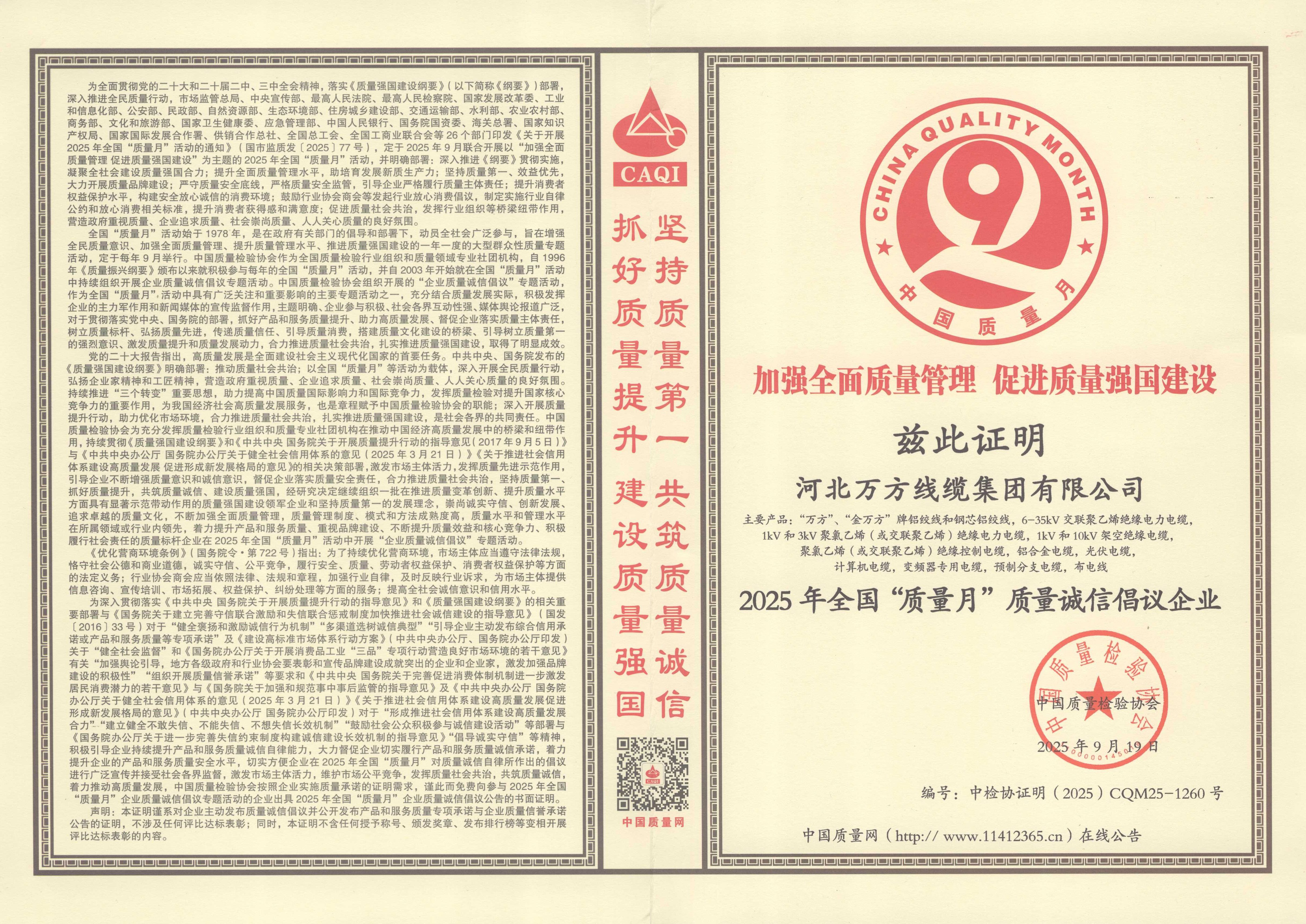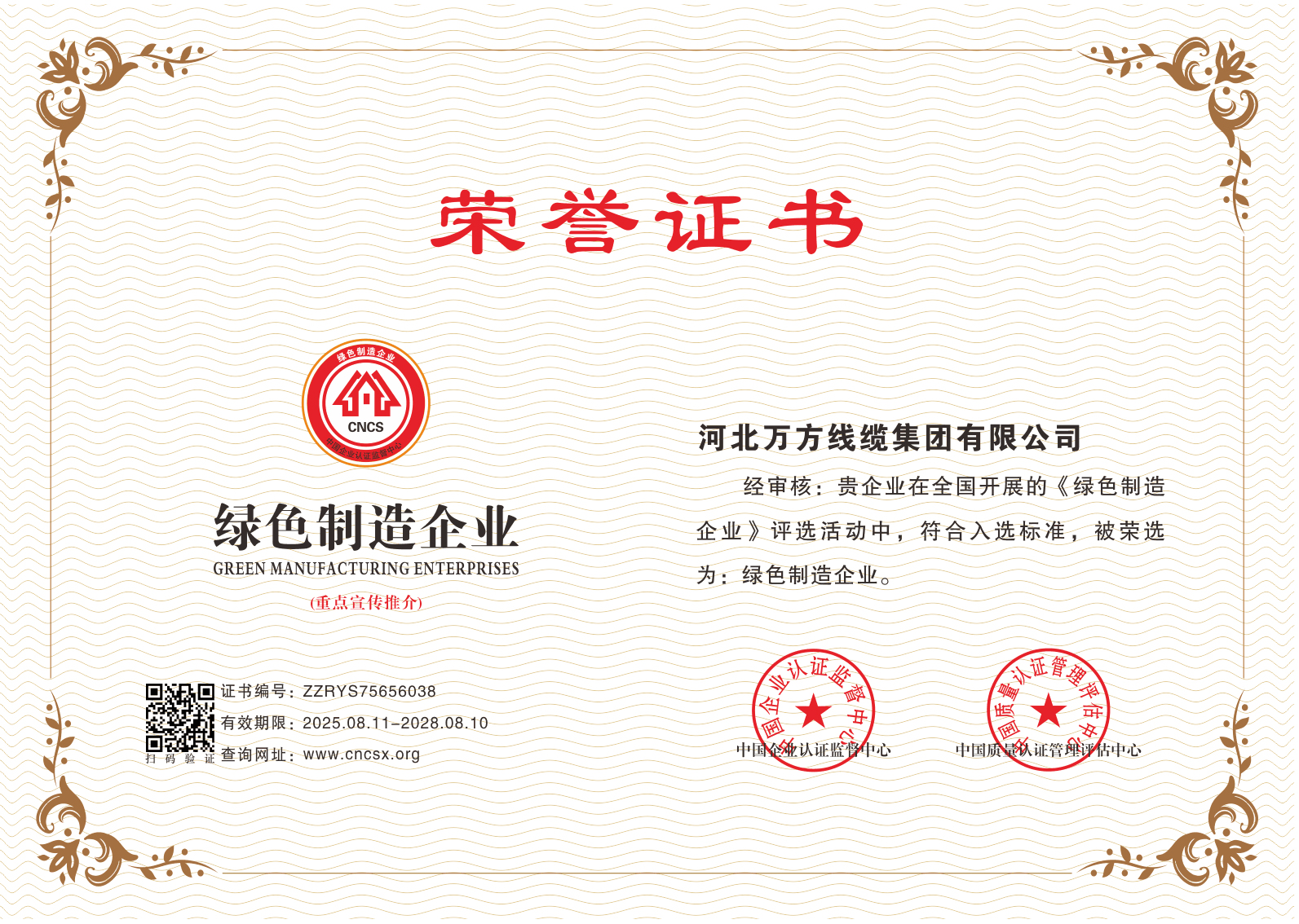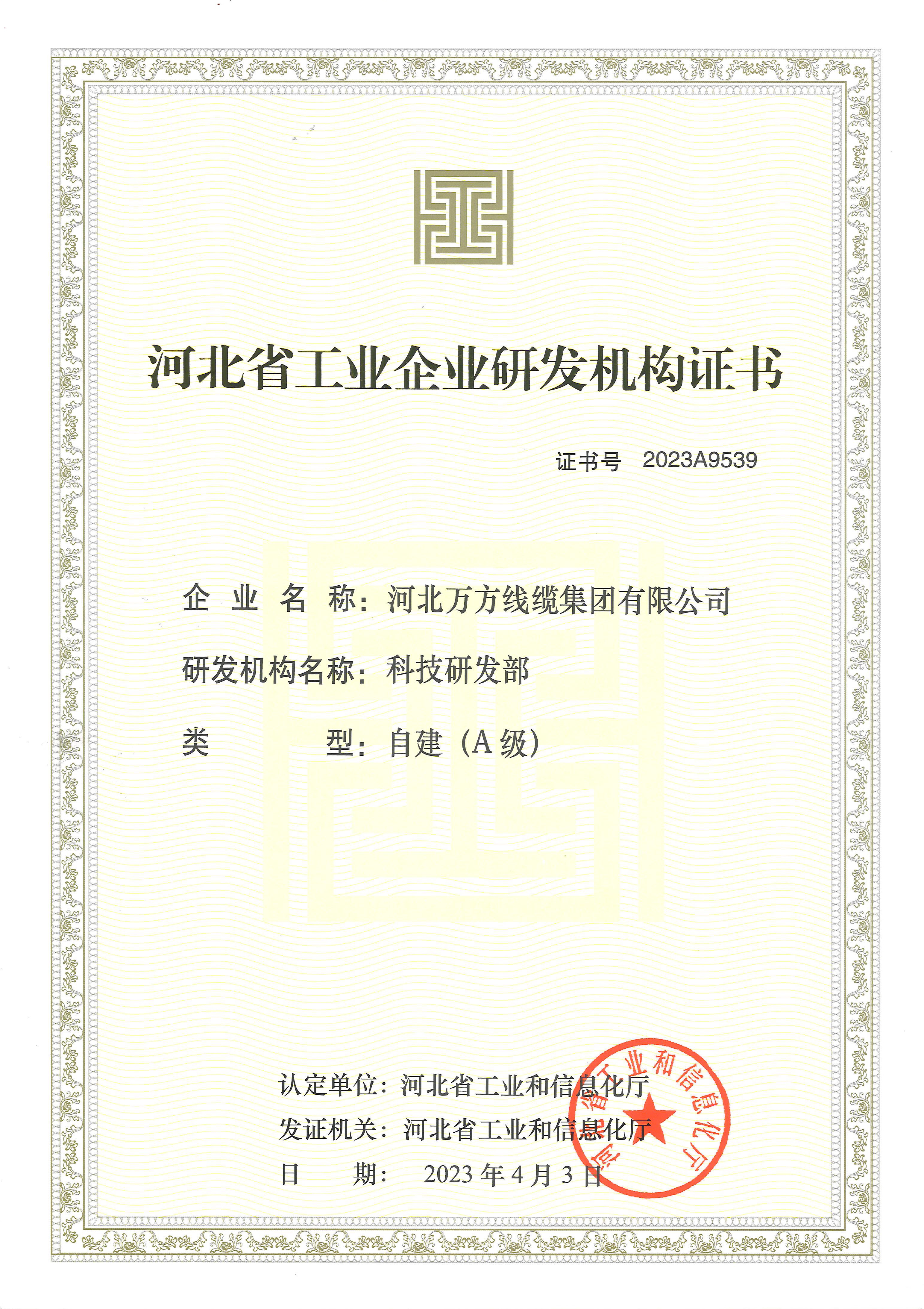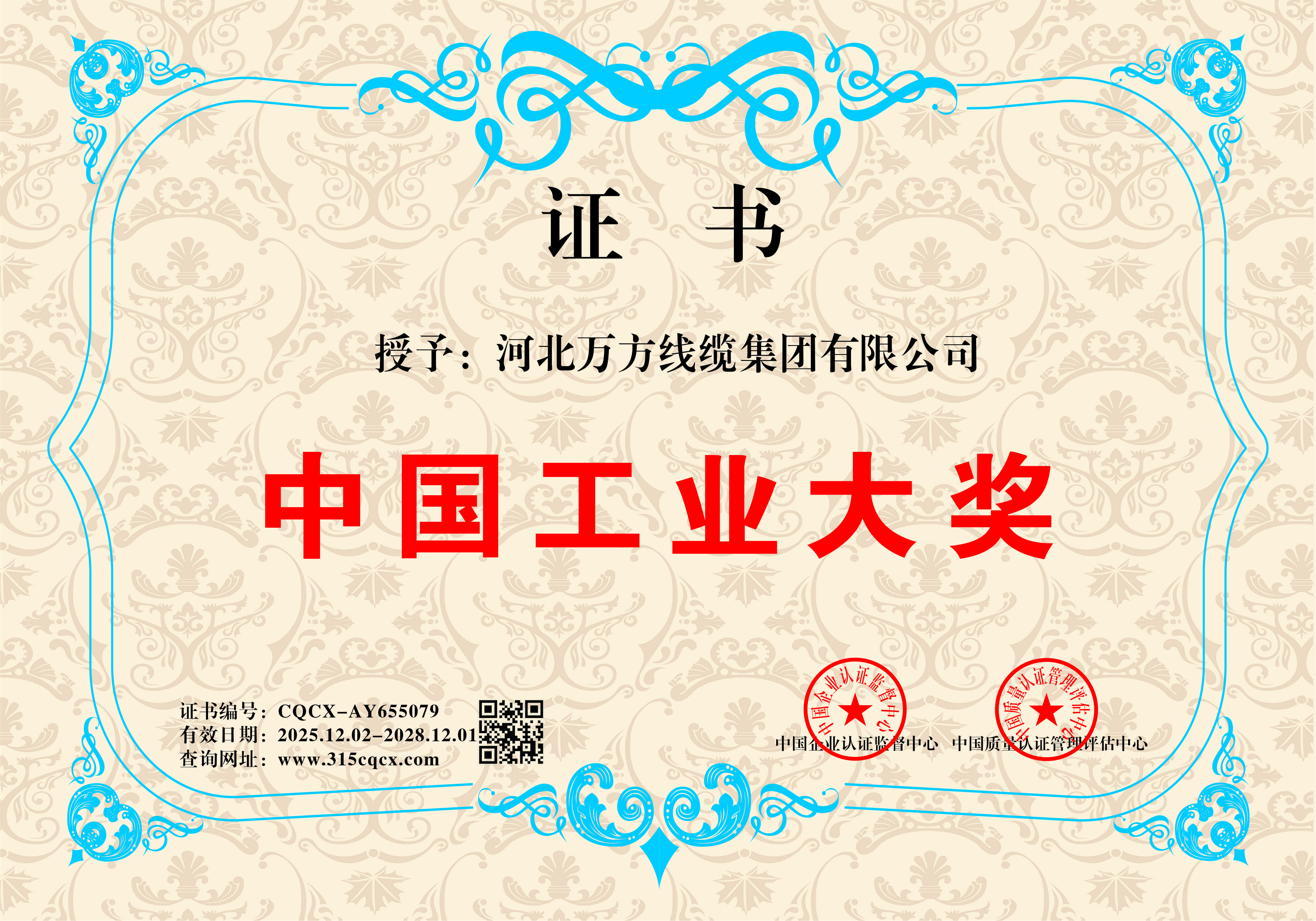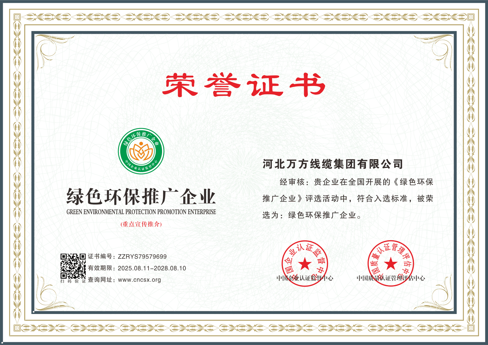 企业被评为:高新技术企业;中国驰名商标;全国行业质量领先企业;全国质量诚信先进企业;全国质量检验稳定合格产品;全国质量检验信得过产品;全国行业质量领先品牌;河北省专精特新示范企业;河北省科学技术成果证书;河北省创新型中小企业;河北省著名商标;河北省名牌产品;河北省质量效益型先进企业;守合同重信用单位;河北省消费者信得过单位;邢台市“文明单位”;国家知名品牌;中国线缆行业100强企业;中国电线电缆企业综合实力200强;河北省最具影响力百强诚信企业等荣誉称号;“AAA级”企业信用等级证书;“AAA级”资信等级证书;“AAA级”重合同守信用企业证书;“AAA级”诚信供应商等级证书;“AAA级”诚信经营示范单位证书;“AAA级”行业诚信单位等级证书;“AAA级”质量、服务诚信单位证书;碳中和承诺示范单位;绿色环保推厂企业;中国节能环保产品;绿色制造企业;邢台市纳税百强企业;邢台市企业技术中心;中国质量奖;中国工业大奖;中国科技进步奖。