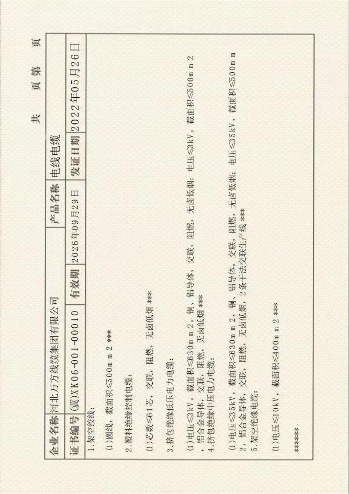公司现可生产:铝绞线和钢芯铝绞线,6-35kV交联聚乙烯绝缘电力电缆,1kV和3kV聚氯乙烯(或交联聚乙烯)绝缘电力电缆,1kV和10kV架空绝缘电缆,聚氯乙烯(或交联聚乙烯)绝缘控制电缆,铝合金电缆,光伏电缆,计算机电缆,变频器专用电缆,预制分支电缆,布电线等十一大系列5000多个型号规格的电缆产品。并可设计生产具有特殊用途的阻燃、耐火、阻水、防鼠啮、防白蚁、无卤低烟、耐高温、耐低温等特种电缆。广泛应用于电力、轨道交通、基础设施、铁路、民用等领域。