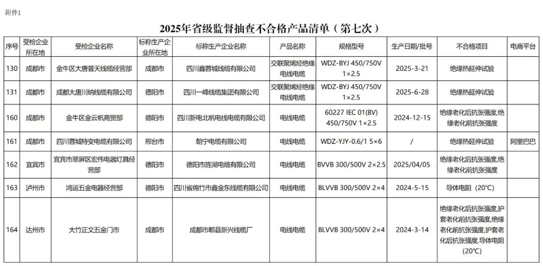四川省市场监管局发布2025年省级监督抽查不合格产品清单(第七次),7批次电线电缆产品不合格
