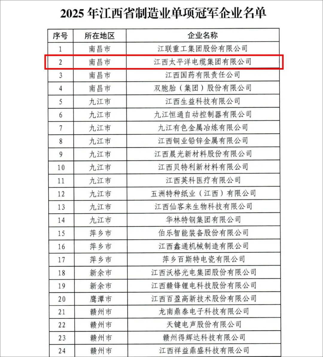 近日,江西省工业和信息化厅发布了2025年江西省制造业单项冠军企业名单,江西太平洋电缆集团成功获评为2025年江西省制造业单项冠军企业。该认定经严格评审,旨在落实国家及省级培育战略,树立行业标杆,推动产业基础高级化与产业链现代化。