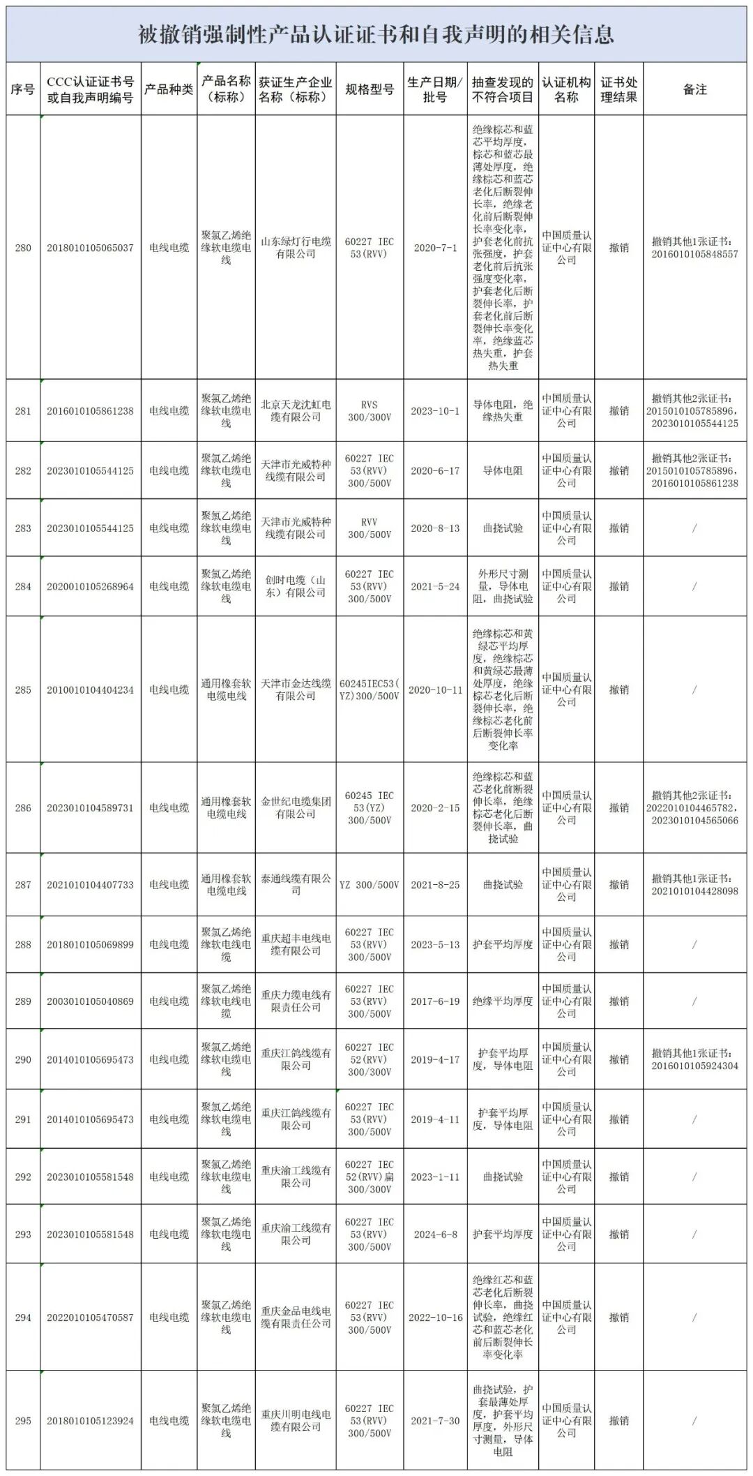 2025年11月12日,市场监管总局发布2025年度第2期认证有效性抽查结果,根据相关抽查信息,认证机构对不符合认证要求的获证企业已作出撤销1557张认证证书的处理。其中,共有16家线缆企业被撤销强制性产品认证证书。