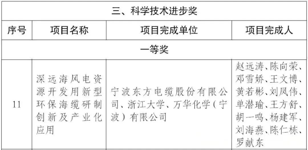 近日,宁波市人民政府公布了2024年度宁波市科学技术奖获奖名单,宁波东方电缆股份有限公司作为第一完成单位申报的“深远海风电资源开发用新型环保海缆研制创新及产业化应用”项目荣获科学技术进步奖一等奖。