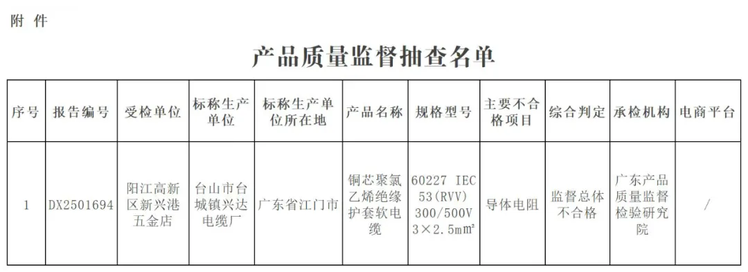 根据《中华人民共和国产品质量法》《产品质量监督抽查管理暂行办法》《广东省产品质量监督条例》等相关规定,2025年阳江市市场监督管理局组织开展电线电缆等13种产品质量监督抽查。本次共抽查产品84款,发现不合格产品10款,其中,线下抽查发现不合格产品3款,线上抽查发现不合格产品6 款,生产领域抽查发现不合格产品1款。不合格产品涉及电线电缆1款、消防器材1款、儿童家具1款、服装3款、刀剪3款、建筑保温材料1款。详情见下表。