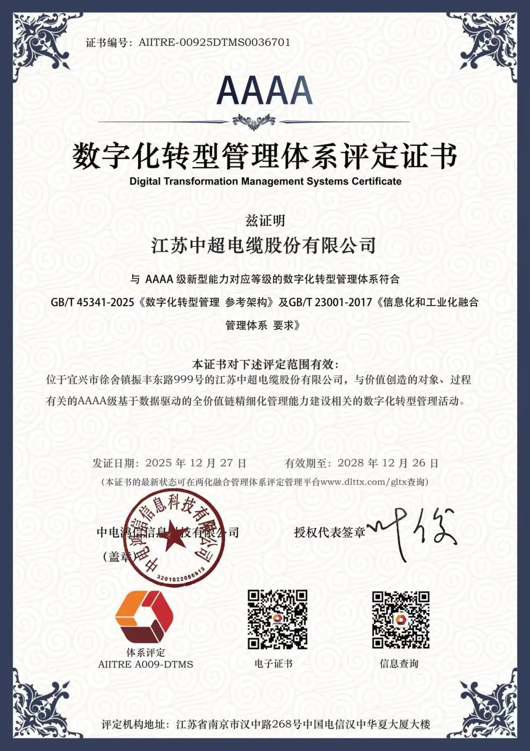 近日,中超电缆正式获得“AAAA级两化融合管理体系认证证书”,是宜兴市首家获得该级别认证的企业。这一重要认证标志着中超电缆在推进信息化与工业化深度融合方面达到国内先进水平。