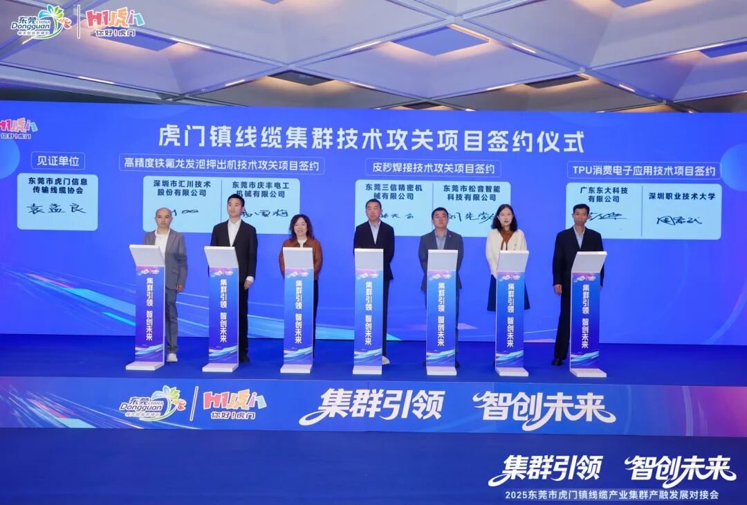 本次大会聚焦线缆行业关键共性难题,举行了虎门镇线缆集群技术攻关项目签约仪式。针对“高精度铁氟龙发泡押出机技术”“皮秒焊接技术”“TPU消费电子应用技术”三大行业痛点,在东莞市虎门信息传输线缆协会牵头下,深圳市汇川技术股份有限公司与东莞市庆丰电工机械有限公司、东莞三信精密机械有限公司与东莞市松音智能科技有限公司、广东东大科技有限公司与深圳职业技术大学分别结成攻关对子,精准发力破解技术瓶颈。