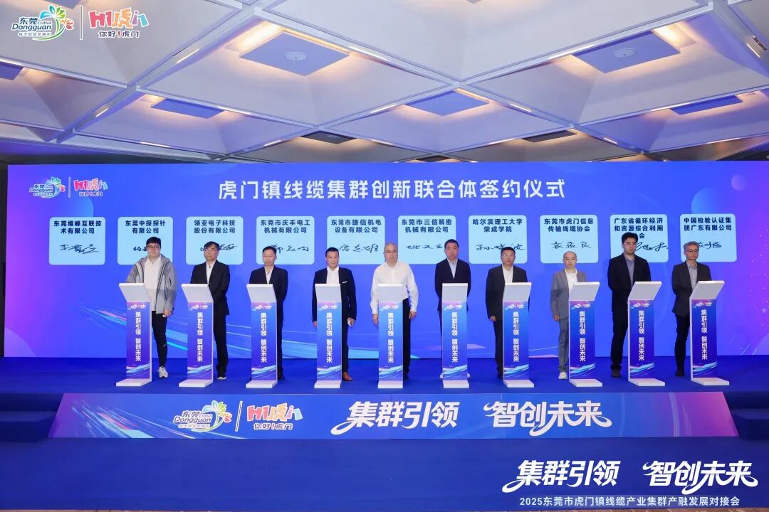 为整合创新资源、加速成果转化,本次大会上,“虎门镇线缆集群创新联合体”正式组建。该联合体由维峰电子、东莞中探探针、领亚电子科技等6家行业领军企业牵头,联合广东省循环经济和资源综合利用协会、东莞市虎门信息传输线缆协会、哈尔滨理工大学荣成学院、中国检验认证集团广东有限公司等多方力量,构建起“政产学研用”深度融合的长效创新机制。