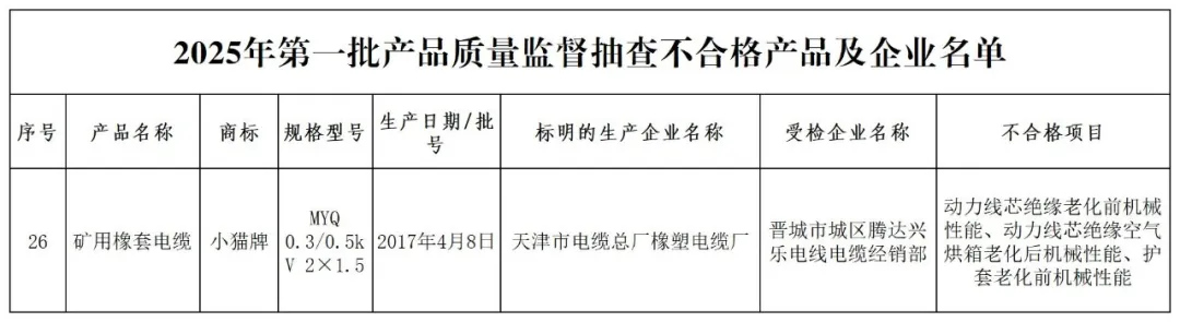 其中,本次共抽查61家电线电缆经销企业的95批次产品。本次抽查重点对导体电阻、绝缘厚度、护套厚度等项目进行了检验。发现1批次不合格,抽查不合格率为1.05%。不合格项目为动力线芯绝缘老化前机械性能、动力线芯绝缘空气烘箱老化后机械性能、护套老化前机械性能。详情见下表。