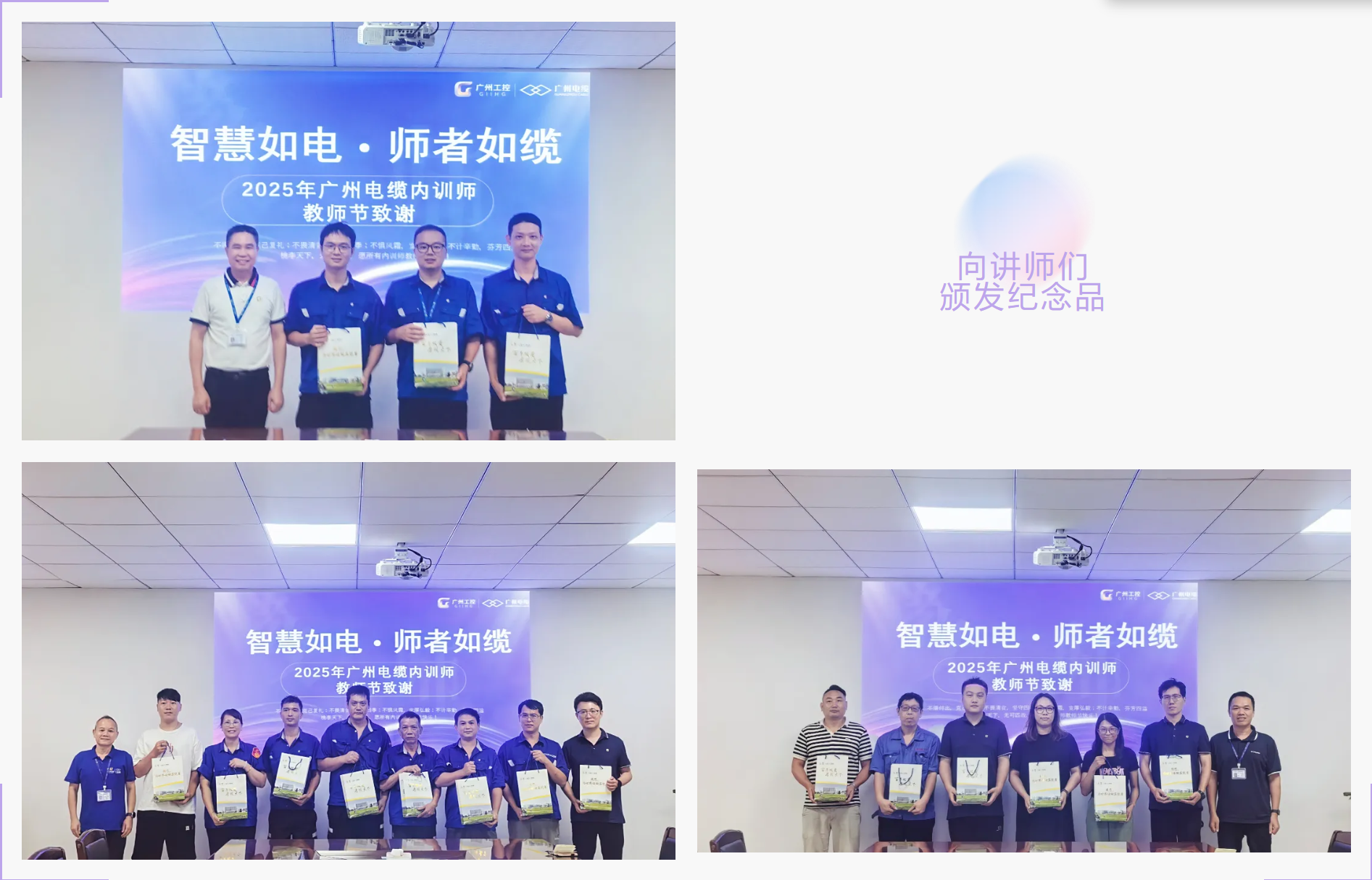 会议首先向全体内训师致以节日问候,感谢他们在广缆的员工培训、技能传授和文化传承中作出的贡献,对职业技能理论和实操讲师代表、广缆工匠讲师代表、营销运营和管理系列课程讲师代表、新员工入职培训讲师代表等多位内训师代表颁发纪念品,感谢他们的辛勤付出。