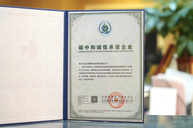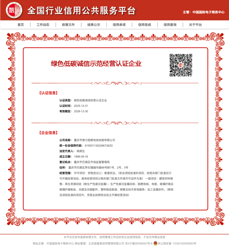 在“推动绿色发展,加快发展方式绿色转型”的国家战略指引下,制造业正迎来一场深刻的绿色革命。近日,从全国行业信用公共服务平台获悉,专注于线缆研发制造的重庆市南方阻燃电线电缆有限公司凭借其在绿色低碳发展领域的卓越实践,成功获得由国家商务部、国资委推动征集的绿色低碳诚信承诺示范企业权威认证。这一殊荣不仅是对企业深耕线缆制造领域的权威认可,更标志着其在重庆市乃至全国制造业民营企业中树立了高质量发展与绿色转型的新标杆。