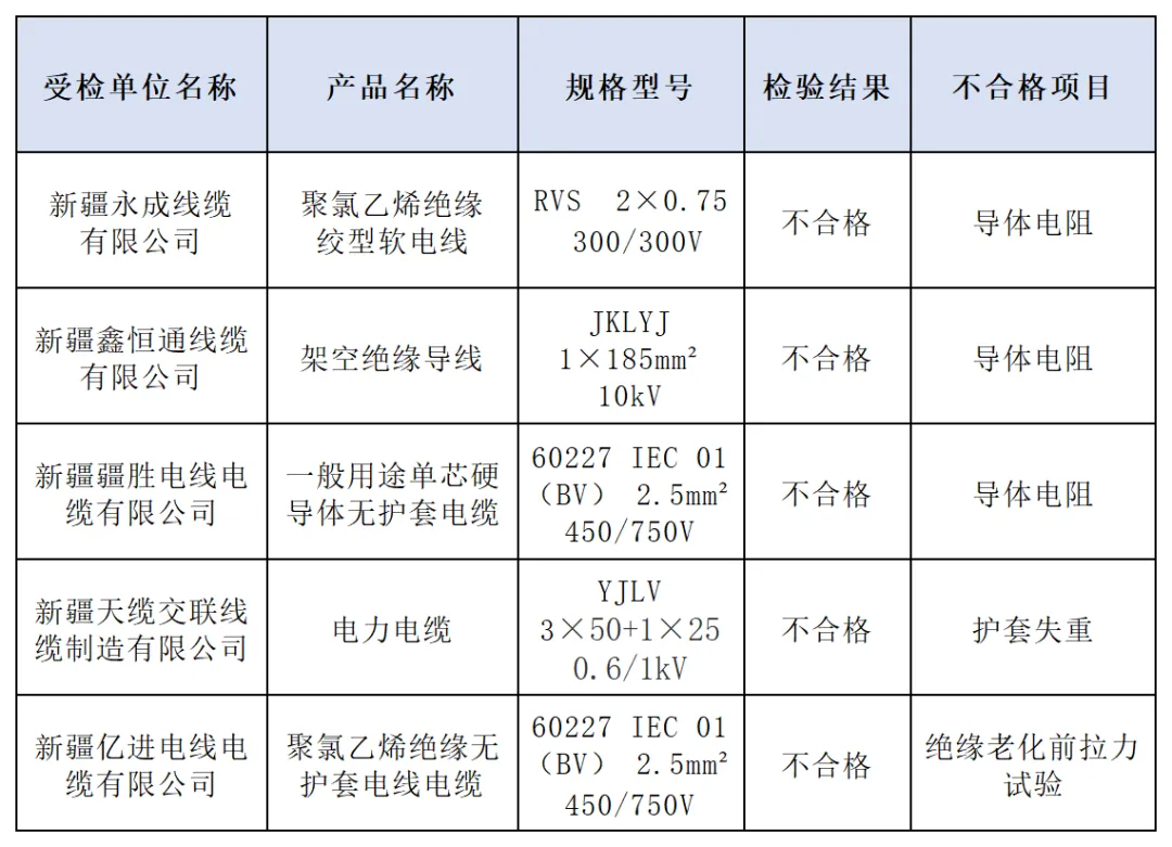 其中,电线电缆检出其本地企业生产的不合格产品5批次。主要不合格项目为导体电阻、护套失重、绝缘老化前拉力等。详情见下表。