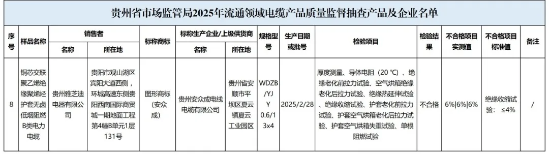 本次共对5家销售者销售的8批次电缆产品开展了监督抽查,抽查区域为贵阳市。本次监督抽查依据GB/T 12706.1-2020《额定电压1kV(Um=1.2kV)到35kV(Um=40.5kV)挤包绝缘电力电缆及附件第1部分:额定电压1kV(Um=1.2kV)和 3 kV(Um=3.6kV)电缆》等标准进行检验。经检验,发现1家销售者销售的1批次产品不合格,不合格项目为绝缘收缩试验,监督抽查不合格率为12.5%。详情见下表。