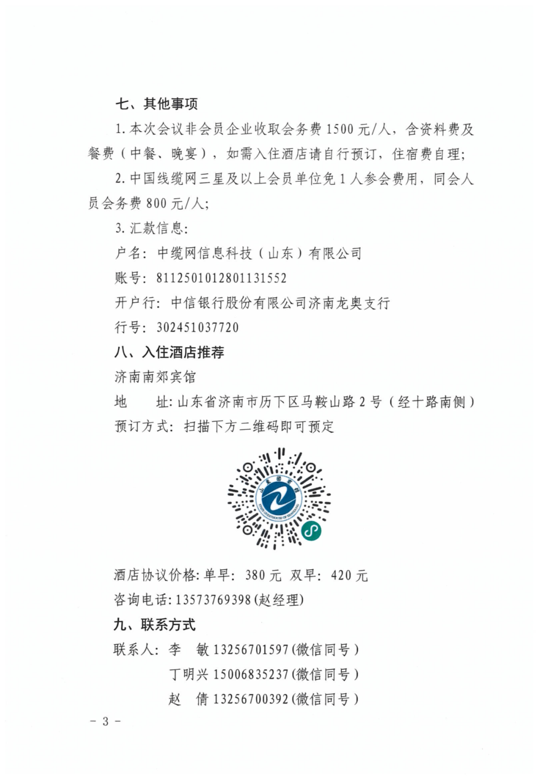 1.本次会议非会员企业收取会务费1500元/人,含资料费及餐费(中餐、晚宴),如需入住酒店请自行预订,住宿费自理;