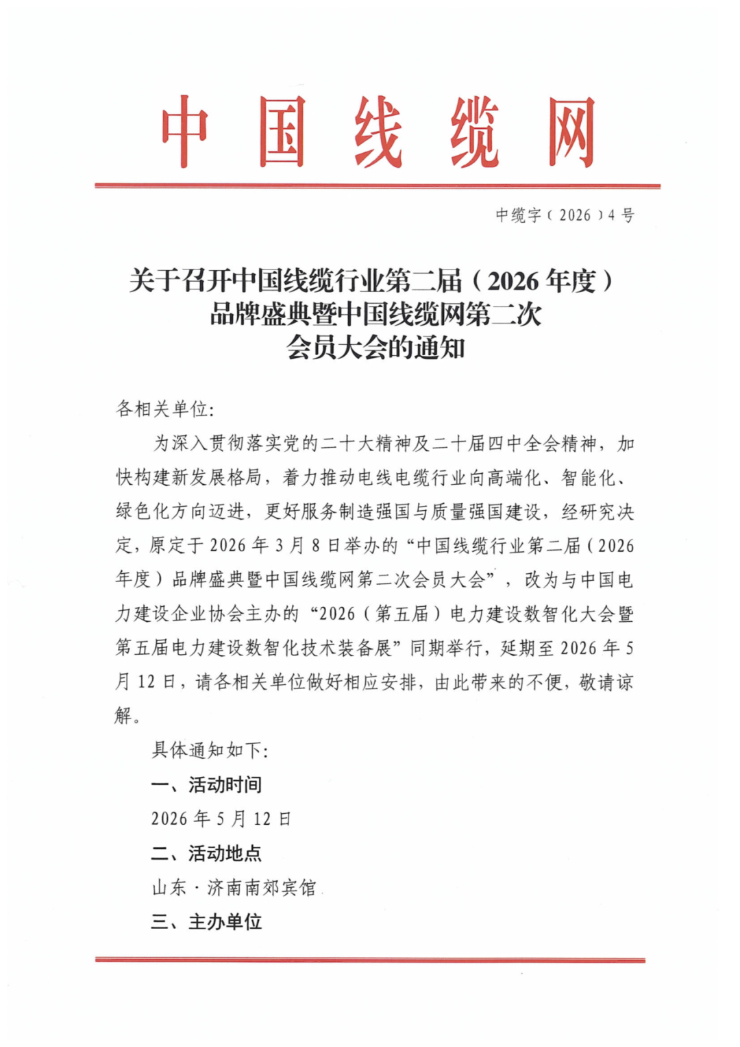 为深入贯彻落实党的二十大精神及二十届四中全会精神,加快构建新发展格局,着力推动电线电缆行业向高端化、智能化、绿色化方向迈进,更好服务制造强国与质量强国建设,经研究决定,原定于2026年3月8日举办的“中国线缆行业第二届(2026年度)品牌盛典暨中国线缆网第二次会员大会”,改为与中国电力建设企业协会主办的“2026(第五届)电力建设数智化大会暨第五届电力建设数智化技术装备展”同期举行,延期至2026年5月12日,请各相关单位做好相应安排,由此带来的不便,敬请谅解。