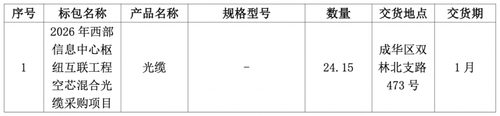 来自中国电信阳光采购网消息,中国电信成都分公司2026年西部信息中心枢纽互联工程空芯混合光缆采购项目正式启动,预估规模为1937554.50元(含税)。