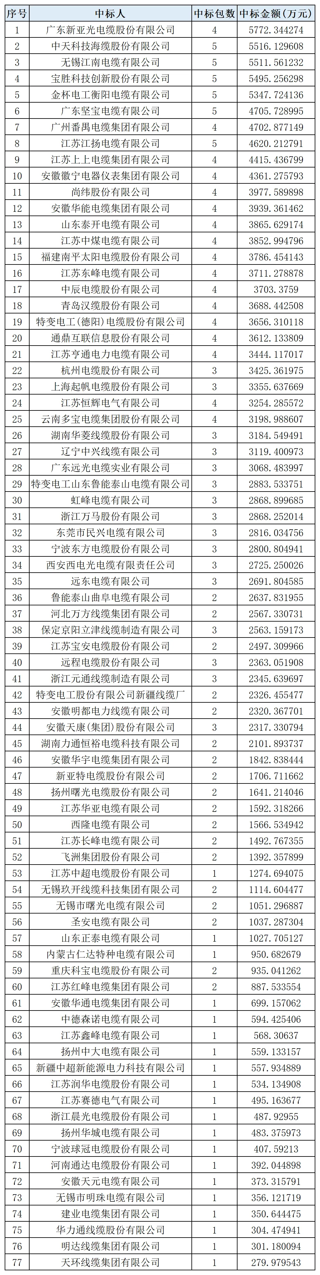 其中,中标前二十名企业为:广东新亚光电缆股份有限公司、中天科技海缆股份有限公司、无锡江南电缆有限公司、宝胜科技创新股份有限公司、金杯电工衡阳电缆有限公司、广东坚宝电缆有限公司、广州番禺电缆集团有限公司、江苏江扬电缆有限公司、江苏上上电缆集团有限公司、安徽徽宁电器仪表集团有限公司、尚纬股份有限公司、安徽华能电缆集团有限公司、山东泰开电缆有限公司、江苏中煤电缆有限公司、福建南平太阳电缆股份有限公司、江苏东峰电缆有限公司、中辰电缆股份有限公司、青岛汉缆股份有限公司、特变电工(德阳)电缆股份有限公司、通鼎互联信息股份有限公司,以上中标前二十的缆企合计中标约8.8亿元,占总中标份额的47%,行业集中度日渐提升。更多中标企业见榜单。