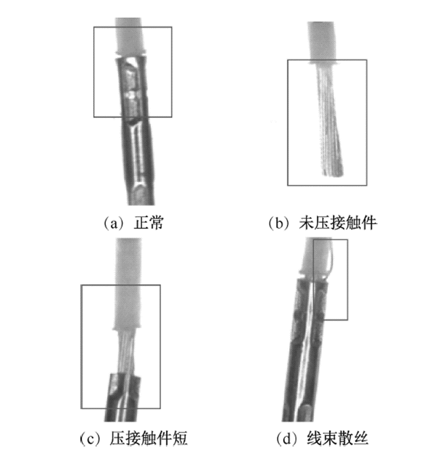 线束端子是线束上的重要组成部分,主要是通过线束剥线、压接接触件端子而形成。该过程是线束装配过程中最为关键的环节,线束剥线环节会出现长短不一、芯线散开等现象,接触件端子与线束压接过程中会出现未成功压接、压接不到位、芯线外漏等质量问题,进而较大程度地降低产品的可靠性。目前,市场上主要运用的是人工目视法进行检测,该方法存在漏检、检测效率不高、工作强度大等问题,而传统机器视觉技术存在缺陷特征难以量化和提取、缺陷图像识别能力弱等不足。近年来,随着机器视觉技术的快速发展,将传统机器视觉与深度学习相结合的线束端子外观缺陷检测技术已成为工业领域检测的一种新趋势。
