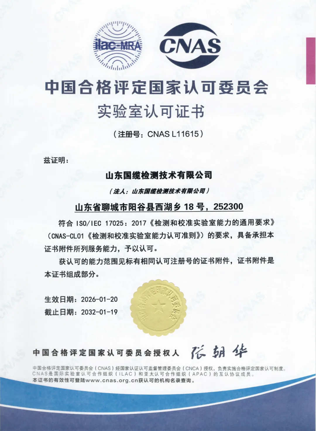近日,中国线缆网全资子公司山东国缆检测技术有限公司(以下简称“山东国缆检测”)正式获得中国合格评定国家认可委员会(CNAS)颁发的实验室认可证书(注册号:CNAS L11615),标志着该公司检测技术能力与管理水平已达到国家权威标准,具备按照国际准则开展检测服务的技术能力和可靠性,在专业化和标准化道路上迈出了关键一步。