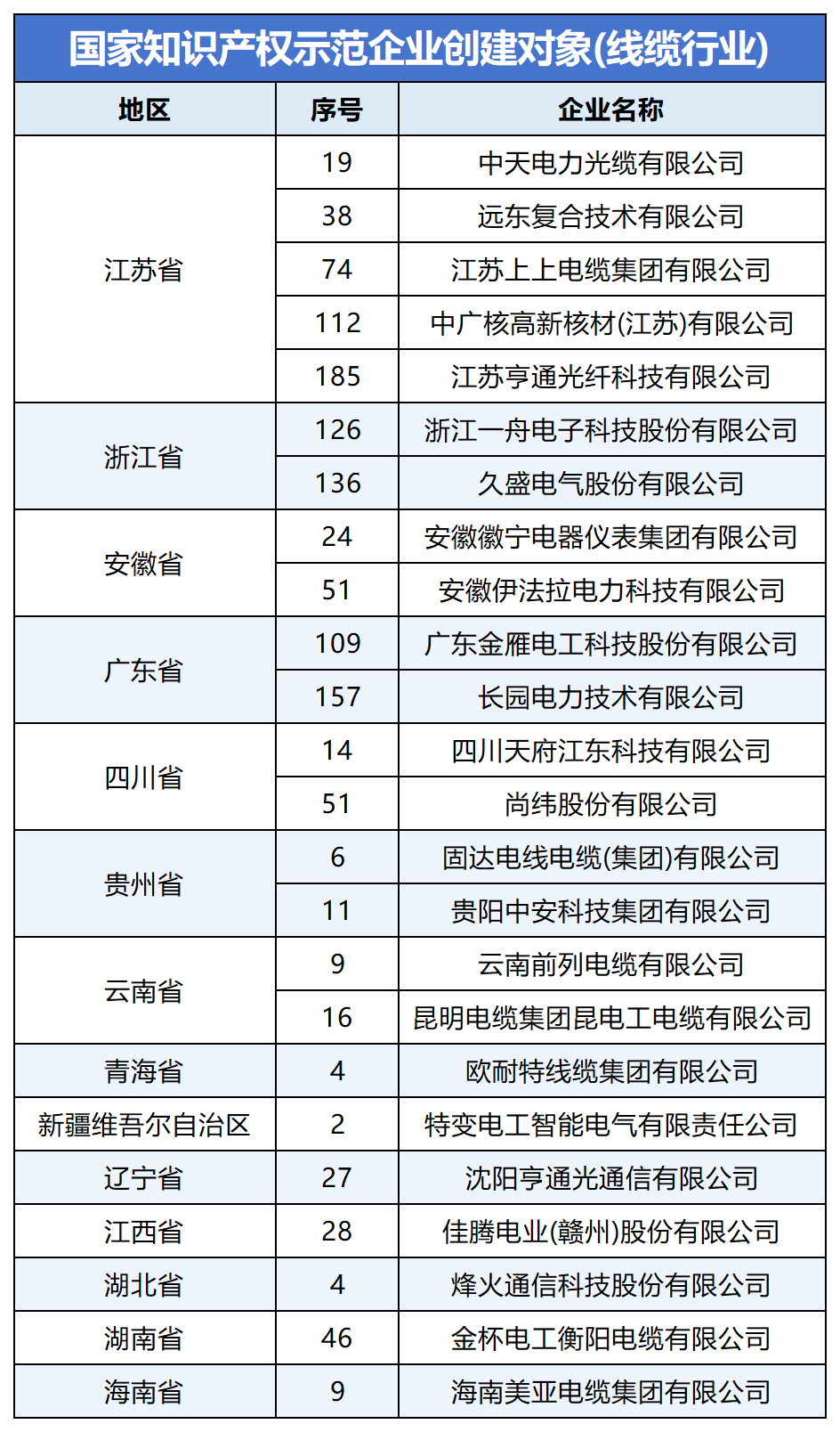 近日,国家知识产权局公示了2025—2027年知识产权强国建设示范创建对象评审结果,全国共逾千家企业入围。其中,众多线缆及相关领域企业,凭借卓越的知识产权综合实力,成功入选“国家知识产权示范企业创建对象”,名单如下: