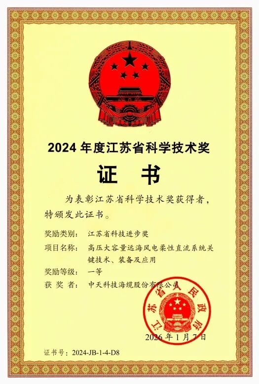 日前,中天科技海缆股份有限公司(简称“中天海缆”)“高压大容量远海风电柔性直流系统关键技术、装备及应用”项目荣获2024年度江苏省科学技术奖一等奖。据悉,此次获奖,源于与国网江苏省电力有限公司、三峡新能源南通有限公司等单位合作建成的亚洲首个柔性直流海底电缆大型海上风电工程——±400kV江苏如东海上风电柔直工程。该项目此前已荣获国家科技进步一等奖,其电压等级与输送容量均达到同期商业化项目最高水平,实现了我国远海风电柔直送出关键技术的自主突破。