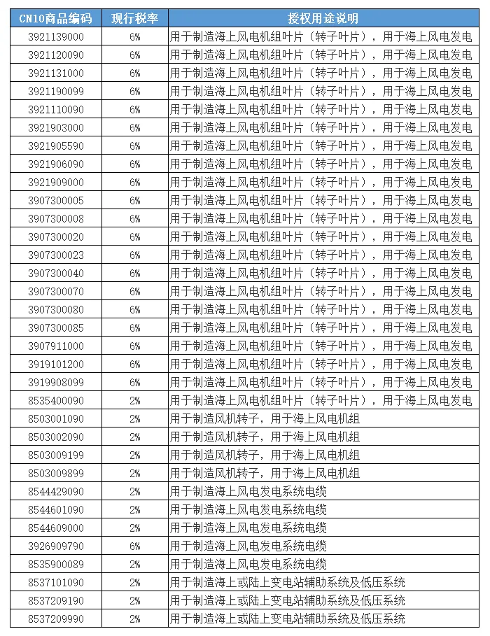 此次政策通过英国海关的“授权用途(Authorised Use)”制度实施。根据该制度,英国企业在进口相关产品时,只要证明其用于指定产业用途,并在规定期限内完成加工或使用,即可适用零关税。相关商品主要涉及风电设备制造所需的关键部件和材料,包括电缆制造相关材料、风机转子及叶片、辅助系统以及低压电气系统等,这些产品主要用于海上或陆上变电站及风力发电机设备的生产。